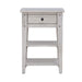 Accent your space with the casual country style Lake House chair side table. Crafted of poplar solids and oak veneers, this piece features an appealing planked top, two open planked shelves, simplistic wood and peg accents, one drawer accented by antiqued brass knob hardware, anchored by a tapered leg design. The golden oak finish allows for a universal appeal.