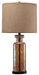 Transparency is in style with this table lamp. A unique pattern reflects in the faceted base as light passes through. Metal in an an antiqued bronze tone beautifully complements the champagne glass finish. A burlap shade adds texture to the smooth design.