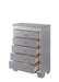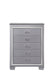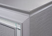 This bedroom collection offers a touch of glamour and luxury to any home. The chic silver finish paired with elegant textured panels creates a sophisticated look that can elevate any bedroom decor. The bed is a statement piece, featuring a stunning tufted headboard with integrated LED lighting that adds a classic touch to the modern design. Accompanying the bed is a selection of matching furniture pieces, including a dresser with a mirror, a tall chest, and nightstands, all finished in the same lustrous silver tone.