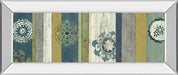 Step into a world where vintage charm meets modern elegance with this beautifully framed wall art. The piece features a harmonious blend of muted blues, greens, golds, and beiges arranged in vertical stripes, each adorned with intricate architectural motifs that evoke a sense of timeless artistry. Encased in a sleek mirrored frame, it reflects light to create a luminous effect, adding depth and sophistication to your living room, dining room, or hallway. Crafted with premium materials and protected by real glass, this artwork promises lasting beauty and a captivating focal point that enriches any space effortlessly.