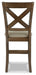 This upholstered bar stool might be simple at first sight, but a closer look reveals beauty in the details. With a distressed nutmeg finish, antiqued nailhead trim and textured polyester upholstery, it's beaming with charm. Cushioned seat ensures long, lingering meals are enjoyed in comfort.