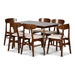 The Morocco Mid-Century Modern Wood Dining Set is a perfect combination of durability, style, and functionality. This set includes a beautifully crafted dining table and elegantly designed chairs, complete with natural cushions that add a touch of sophistication. Constructed from solid rubberwood and Okoume wood veneers, this dining set is built to last, featuring solid tapered table legs, a sturdy table apron, and chair side stretchers that provide unparalleled strength and stability. The clean, sleek lines of the mid-century modern design are enhanced by a warm finish. Perfectly sized for apartments, kitchens, and smaller dining spaces, the 47-inch table comfortably seats up to people, allowing you to maximize your space without sacrificing style or functionality. The chairs feature cradling curved oval seat backs that provide excellent support and comfort, while the 100% polyester upholstered seat cushions are easy to care for and add a modern touch. The Morocco is a statement set that combines elegance, comfort, and practicality. Whether you’re hosting a dinner party or enjoying a quiet meal with family, this dining set promises to make every occasion special.
