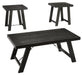 | Details | Includes coffee table and 2 end tables, Made of Acacia veneers, wood and engineered wood, Distressed black wash finish, Canted legs with stretchers, Tops have a bread board layup with a planked effect, Coffee table with tension bars, Assembly required | |