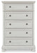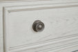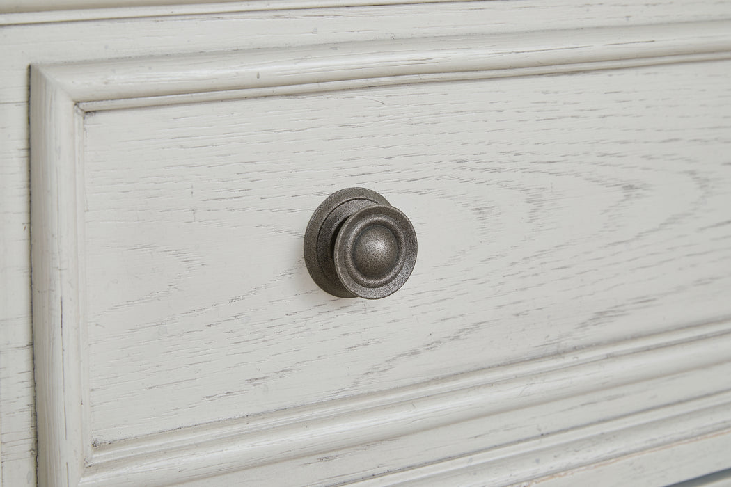 | Details | Made with select oak veneer, engineered wood, solid wood components and cast resin components, Antiqued white finish with grain texture, Dark bronze-tone knobs, 5 smooth-gliding drawers with dovetail construction with metal ball bearing side glides, Upper drawer with felt bottom | |