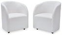 Inspired by art deco design, this fully upholstered dining chair makes a lasting impression in a simply stunning way. Its magnificent curved silhouette is enhanced with a neutral boucle upholstery that’s so pleasing to the palate. This is the piece you’ve been looking for to elevate your contemporary decor whether you’re dining, listening to your latest playlist or binge-watching with friends. Plus, it’s set on casters so it’s easy to move around.