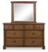 | Details | Includes dresser and mirror, Dresser made with hardwood solids, mango wood veneer and MDF substrates , Mirror made with solid wood, Medium brown wood-tone finish, Metal hardware with pewter-tone finish, 8 smooth-gliding drawers with fully finished interiors, French/English dovetail construction and heavy-duty ball-bearing side glides (top drawers felt lined), Mirror attaches to back of dresser | |