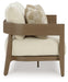 Elevate the appeal of easy-breezy living with this outdoor loveseat. Made to look like wood yet durable enough to weather the elements, it's sure to serve you and your besties well, year after year. The gently curved piece features cushions wrapped in Nuvella+™ high-performance fabric for plush refinement. Patterned accent pillows infuse delightful texture.