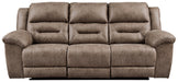 | Details | Includes power reclining sofa, power reclining loveseat and power rocker recliner, Dual-sided recliners; middle seat of sofa remains stationary, Corner-blocked frame with metal reinforced seats, One-touch power control with adjustable positions, Recliner with gentle rocking motion, Attached cushions, High-resiliency foam cushions wrapped in thick poly fiber, Polyester/polyurethane (faux leather) upholstery, Loveseat with center console with storage and 2 cup holders, Power cord included; UL Listed | |