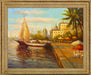 Step into a tranquil coastal scene with this stunning oil painting that captures the essence of a lively harbor bathed in warm sunlight. The artwork showcases sailboats gently resting on shimmering water, with golden-hued architecture and lush palm trees lining a vibrant promenade. Framed in an elegant gilded radiance frame, this piece brings a soothing blend of gold, blue, and earthy tones to your living room or office, inviting you to experience the peaceful charm and timeless allure of seaside life every day.