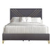 Experience luxury with the Symmetry Upholstered Panel Bed. Crafted from premium woods with a gray marble laminate, it radiates timeless elegance. Gold metal and mylar accents shine against ultra-soft gray fabric, while intricate detailing adds sophistication. The padded headboard, with stylish V-shaped accents, offers cozy support for relaxation. Includes 1 panel headboard, 1 panel footboard, 2 side rails, and 1 slat kit—designed for both comfort and glamour in your bedroom.