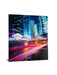 "City Lights" captures the vibrant energy of a bustling urban nightscape, where towering skyscrapers glow with cool blues and the rush of traffic paints streaks of warm light across the scene. Printed beneath durable tempered glass and hand-embellished for a dimensional finish, this contemporary photographic wall art brings a sleek, luminous depth to any living room, office, or bedroom. Its frameless design and ready-to-hang sawtooth hangers offer a clean, modern look that complements the dynamic city vibe, while each purchase contributes to a meaningful social impact by donating a meal to a hungry child.